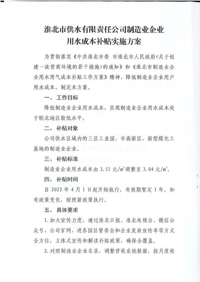 淮北市供水有限責(zé)任公司關(guān)于印發(fā)制造業(yè)企業(yè)用水成本補貼實施方案的通知 淮供水字【2022】24號