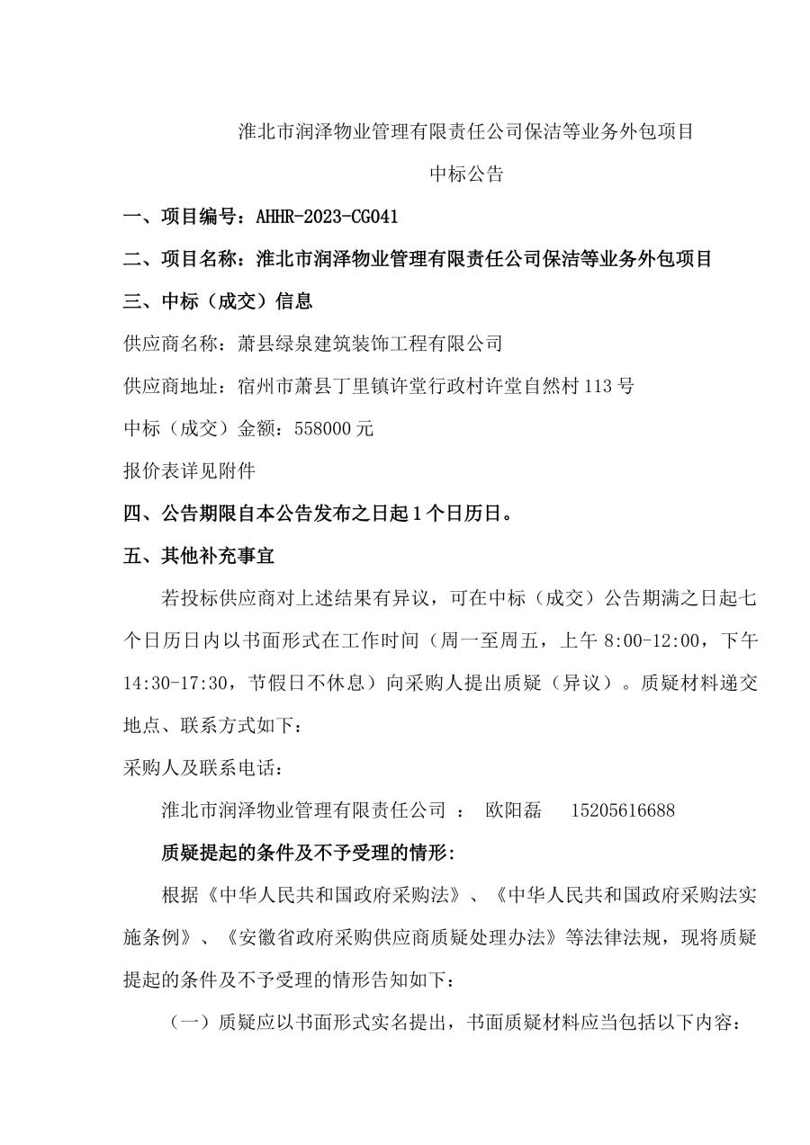 淮北市潤澤物業(yè)管理有限責(zé)任公司保潔等業(yè)務(wù)外包項目中標(biāo)公告