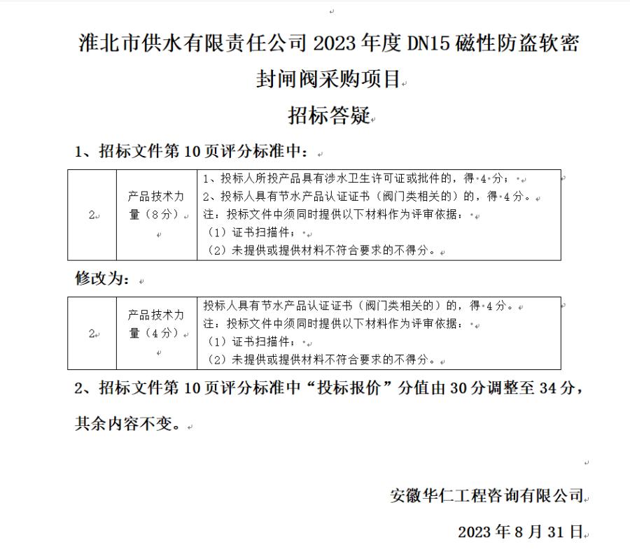 淮北市供水有限責(zé)任公司2023年度DN15磁性防盜軟密封閘閥采購(gòu)項(xiàng)目招標(biāo)答疑