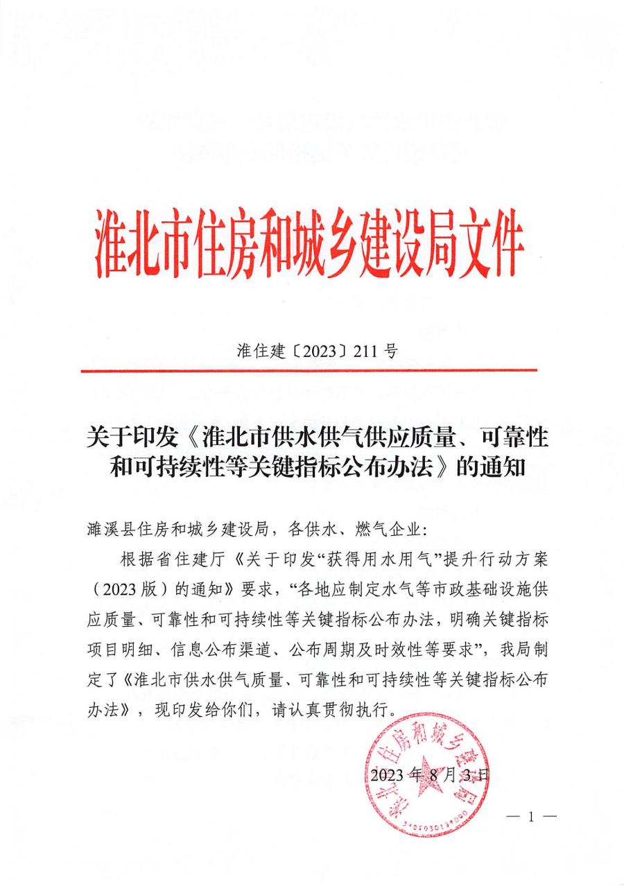 關(guān)于印發(fā)《淮北市供水供氣供應(yīng)質(zhì)量、可靠性和可持續(xù)性等關(guān)鍵指標(biāo)公布辦法》的通知