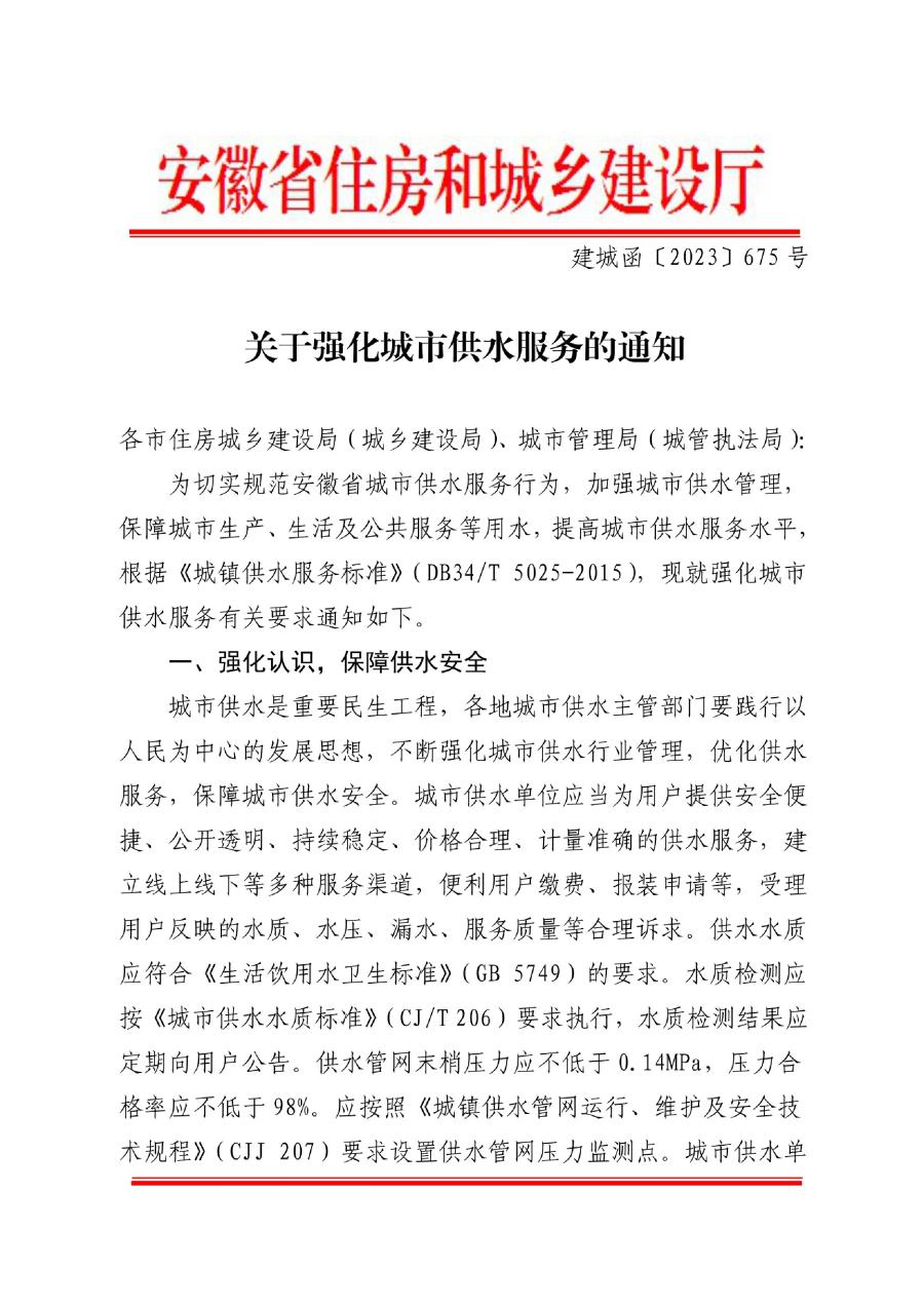 安徽省住房和城鄉(xiāng)建設廳關于強化城市供水服務的通知
