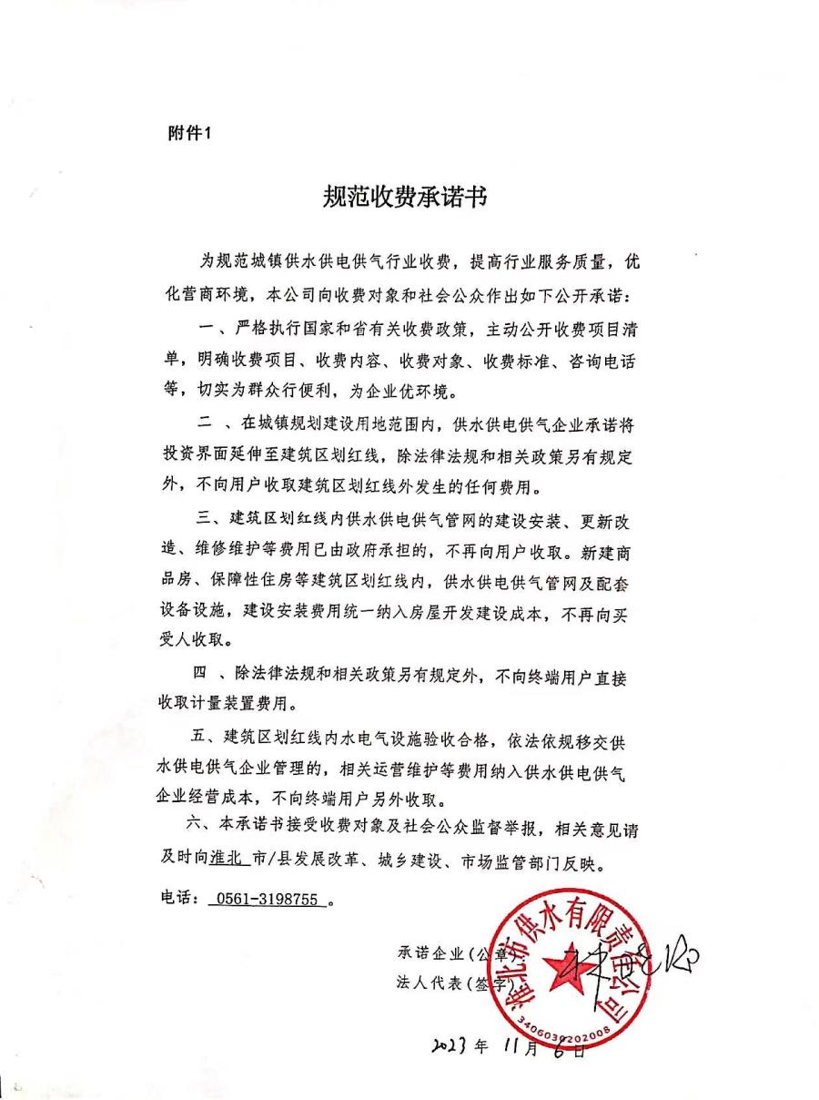 淮北市供水有限責任公司規(guī)范收費承諾書