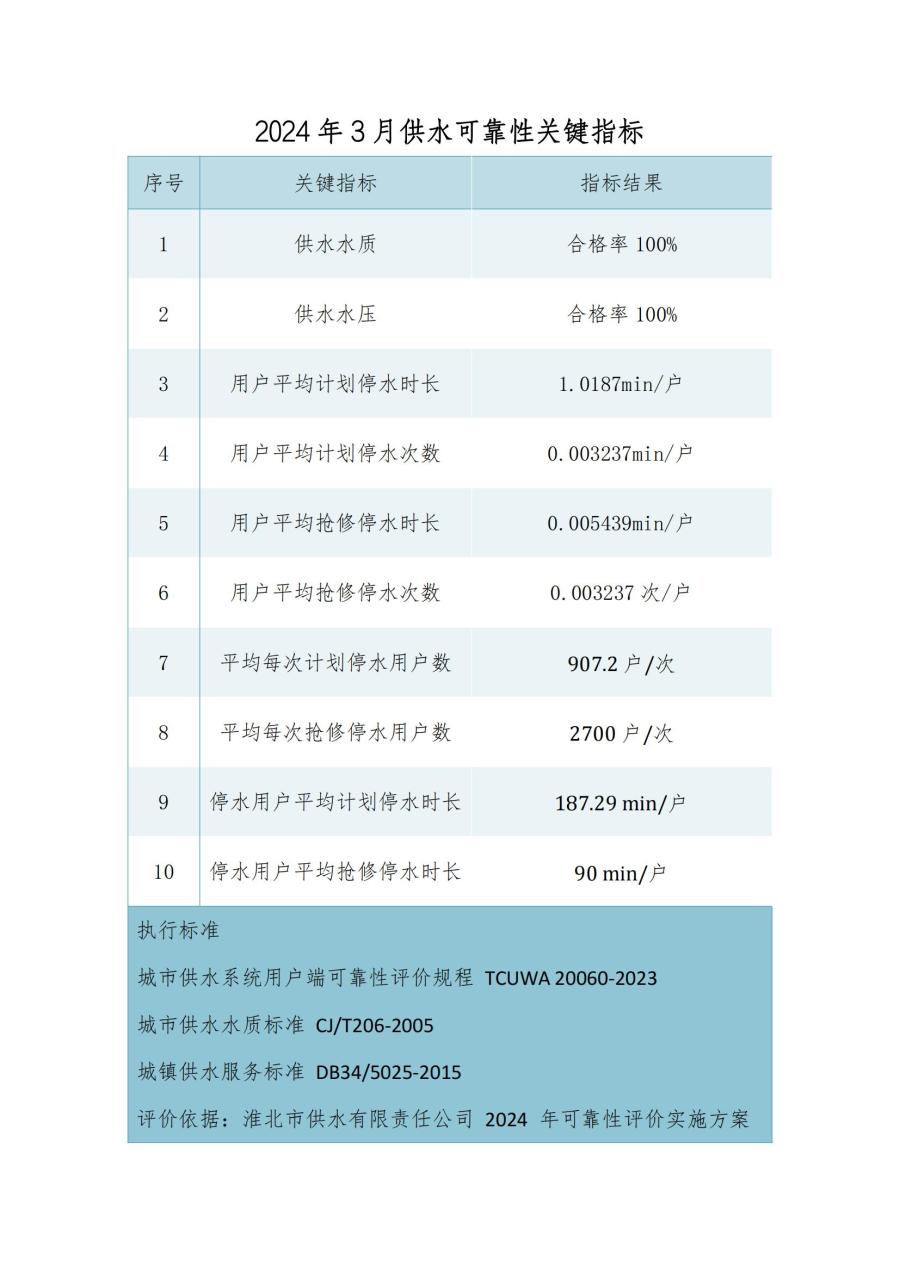 2024年度3月份淮北市供水可靠性關(guān)鍵指標(biāo)