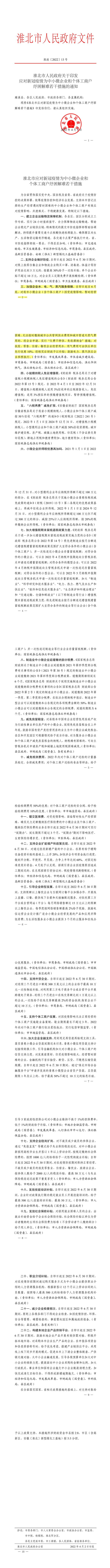 淮北市人民政府關(guān)于印發(fā)應(yīng)對(duì)新冠疫情為中小微企業(yè)和個(gè)體工商戶紓困解難若干措施的通知 淮政【2022】13號(hào)